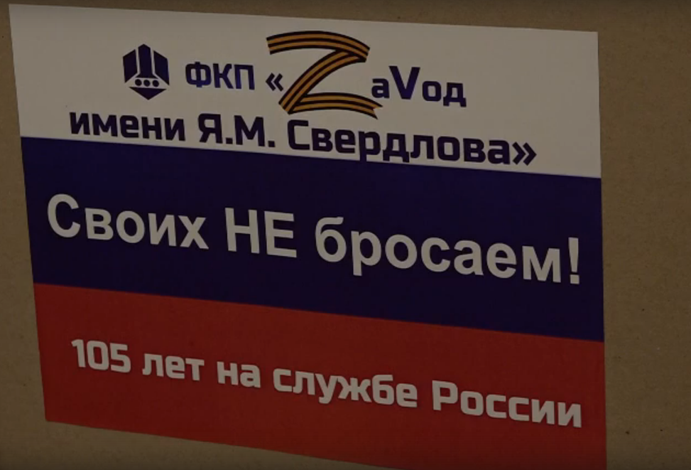 Image from VK group of the factory: “State Owned Enterprise Ya. M. Sverdlov Plant”, “We don’t leave ours!”, “Serving Russia for 105 years.” The Russian word Zavod (‘plant’) is pictured with “Z” and “V” symbols absent from the Russian alphabet. Those letters are actively used by pro-Russian supporters.