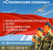 “Stalin’s Falcons” recruitment poster. Russian text says: “1. Do you want to learn a profession of the future? 2. Patriot 3. Do you want to help the country? 4. Your time has come“.