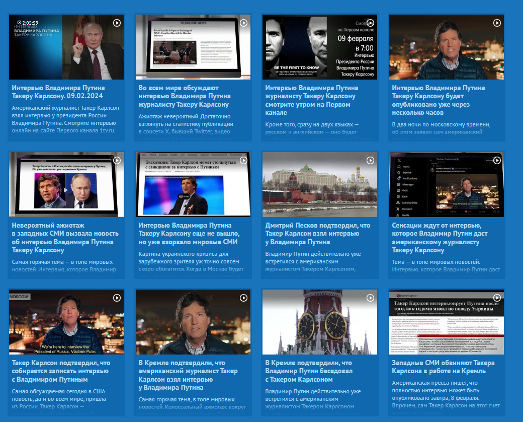 Since the announcement, Russian state and pro-state propaganda outlets have been showcasing widespread enthusiasm for the Putin interview with Tucker Carlson. The activity began with Channel One, Russia’s largest state-controlled television network, broadcasting numerous segments dedicated to this event. These segments featured a range of narratives from state-aligned propagandists and influencers to opposition political commentators. Nonetheless, the focus of this WNM piece is primarily on the efforts by the state and its supporters to influence public sentiment surrounding the media event.
