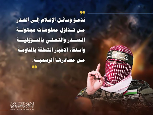 The text on the image says: “We call on the media to be careful not to circulate information from unknown sources, to be responsible, and to seek news related to the resistance from official sources”. This statement appears to have been made in response to Israeli announcements regarding the kidnapping and assassination of Al-Qassam’s leaders.
