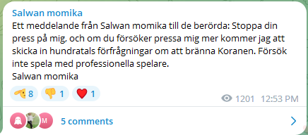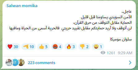 “Urgent.. Swedish security bargains with us a little while ago. Protection in exchange for stopping the burning of the Quran, I will not stop and I do not want to protect you in return for restricting my freedom, as freedom is higher than life and what is in it. Salwan Momika.”