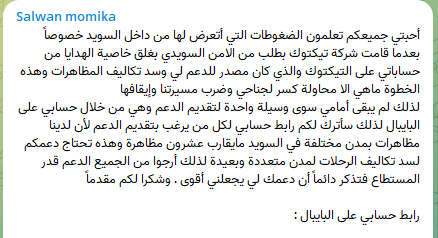 “Therefore, there is only one way left for me to provide support, which is through my account on PayPal, so I will leave you a link to my account for everyone who wants to provide support, because we have demonstrations in different cities in Sweden, about 20 demonstrations, and these need your support to cover the costs of trips to multiple cities and far away, so I ask everyone to support. Always remember that your support makes me stronger. Thank you in advance. [Here is] My PayPal account link”
