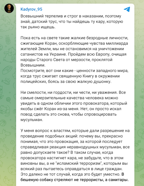 Ramzan Kadyrov reacted to this event by saying “…while there are such ruthless individuals in the world who burn the Koran and insult the feelings of more than a billion inhabitants of the Earth, we will not stop at the destruction of Satanists in Ukraine. […] We will go through all of Europe, cleansing the peoples of the Old World from abomination.” He also stated that the politician would be punished, and the authorities who allowed the action would be to blame. Kadyrov spoke metaphorically about the consequences of this act that it was not the terrorists who were shooting at the rabid dog, but the orderlies. He called Rasmus a “religious terrorist who needs to be cleared from the Earth”.