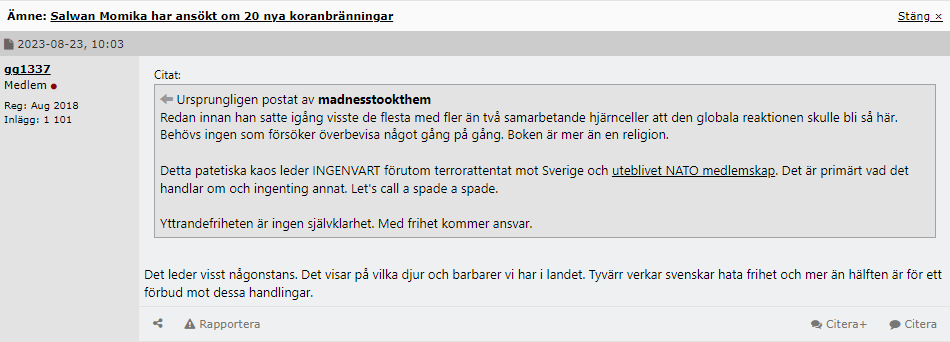 “It’s great that he’s going to burn it 20 more times. I hope more people are inspired and start burning it too. Maybe Rasmus Paludan will return next spring when it’s an election year. Islam is crap and should be removed from Sweden. The Koran should be banned. What is in the Koran incites hatred against ethnic groups. Islam is not a religion but a comprehensive and all-encompassing ism and ideology, at least as much, and one must be allowed to protest against it and show all their disgust for it.