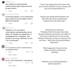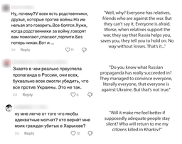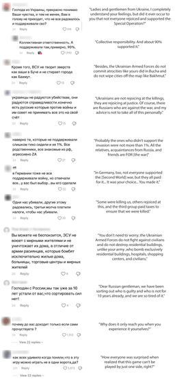 On the other hand, some comments reflect defensiveness and denial, with individuals downplaying the severity of the situation or distancing themselves from the conflict, often accompanied by a lack of empathy. This defensiveness is evident in comments that attempt to justify the actions of the Russian government or dismiss the suffering of others.